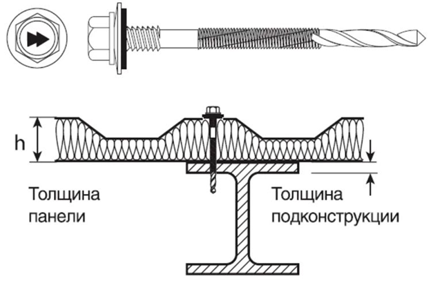 Эти метизы имеют два участка резьбы, один в нижней части стержня с мелким шагом для лучшей фиксации в несущей металлоконструкции, второй с крупным шагом около головки для жесткого закрепления внешнего листа сэндвич-панелей и предотвращения его колебания.