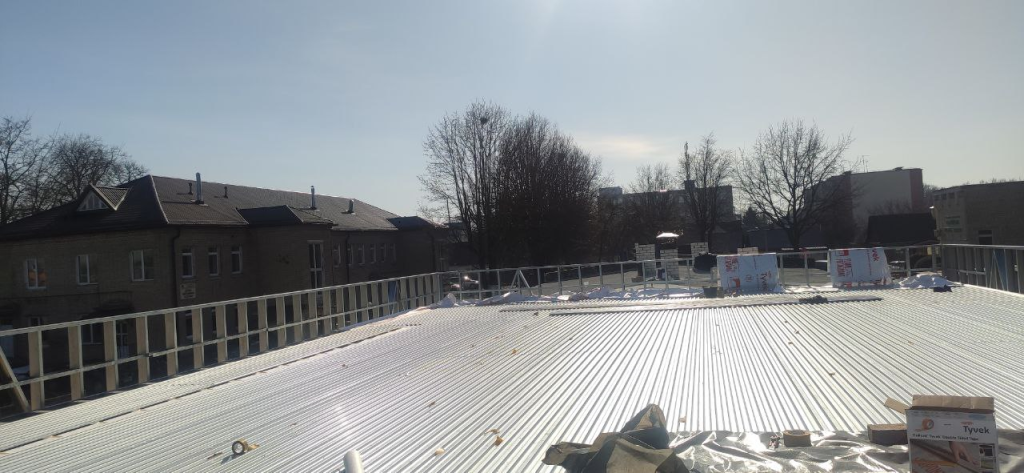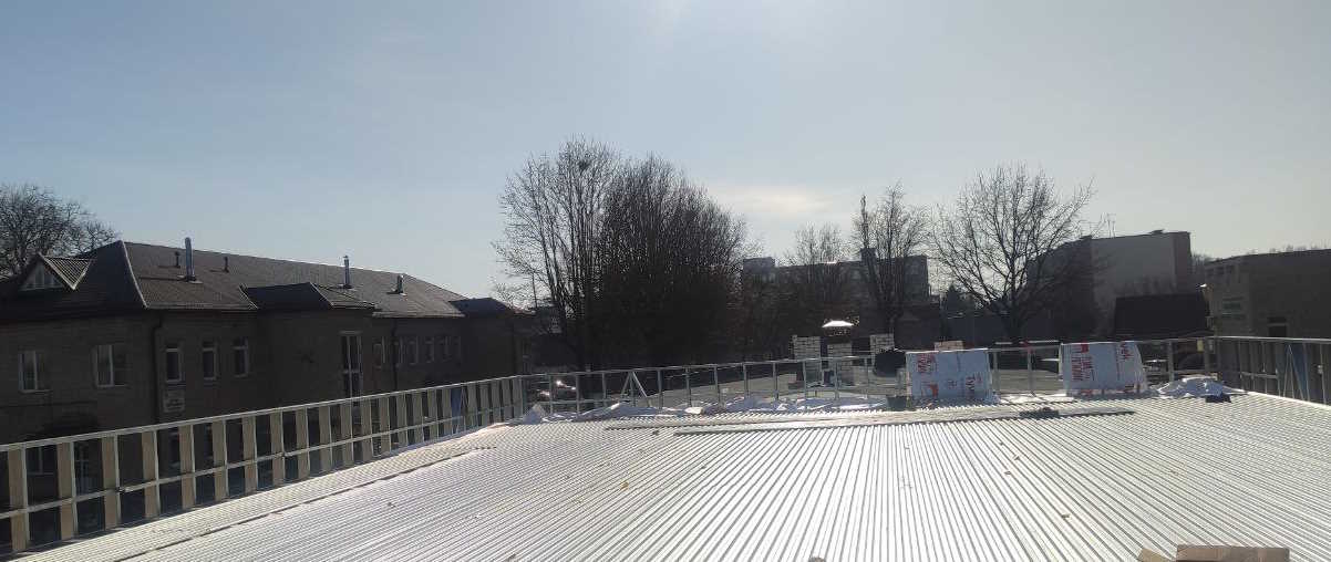 Впервые в своей практике на данном объекте мы применили кровельную клиновидную систему утепления из кварцевых минераловатных плит «Ветонит». Монтаж теплоизоляции будет осуществляться по основанию из перекрытия ЛСТК из стального профилированного листа.